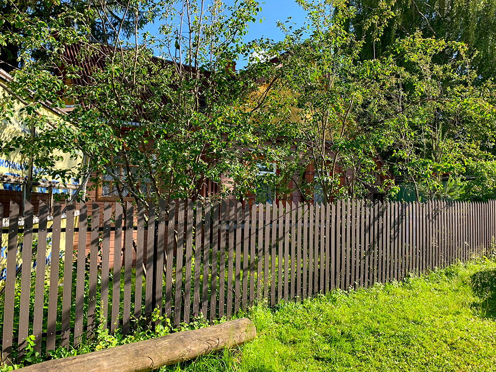 Для реализации этого проекта, нам понадобился специальный узкий полнотелый штакетник из ДПК. Ведь у владельца не так много времени посещать дачу и постоянно поддерживать деревянный штакетник в идеальной форме. Для ДПК-же такой уход не требуется и достаточно просто использовать по мере необходимости специальное средство для очистки ДПК и средство для защиты декинга. И он прослужит вам долгие годы не потребовав ничего дополнительно.